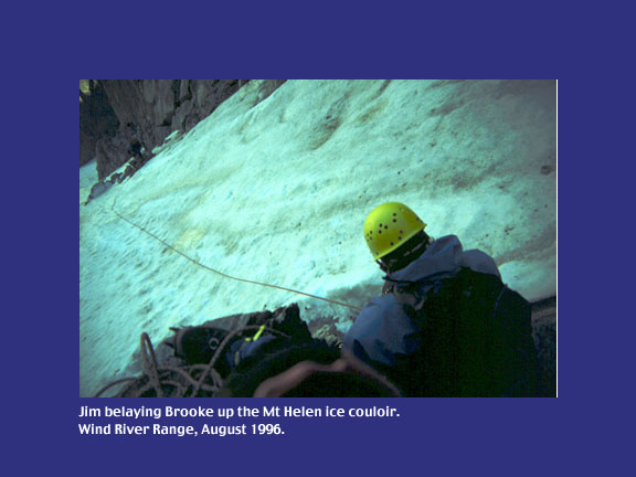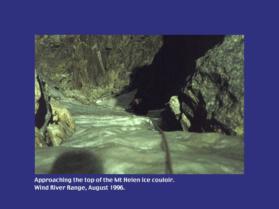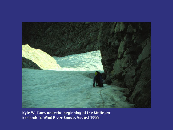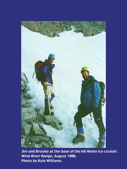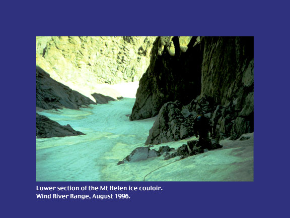 The next day Kyle and I planned to climb the Mt Helen ice couloir, which is supposed to be among the best in the range and on a par with the Black Ice Couloir. Another climber, Brooke, decided to join us. I led the entire climb, with Kyle climbing second and Brooke last. I was able to climb with only one general purpose ice axe, so I think it is less difficult than the Black Ice Couloir. Brooke had flexible leather boots and had never climbed anything of this nature before, so he found it to be a bit of a challenge. It was a really nice route, and Brooke made it up ok.